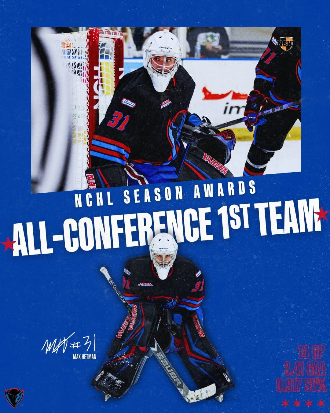 Congratulations to Max Hetman on being named to the All-Conference 1st Team! Heβs been fun to watch between the pipes all season and a huge presence in net.